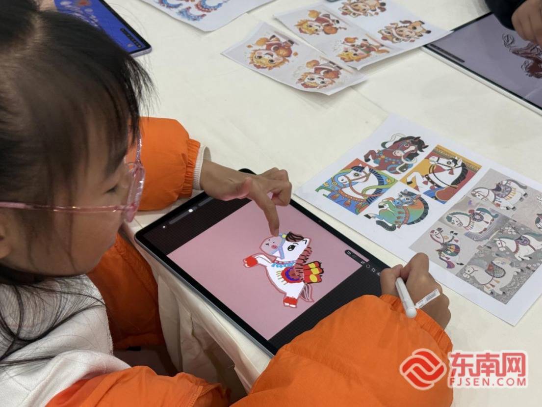 r为让观众更深入地参与这场文化实践,展览期间同步推出了系列配套活动。2月1日上午,十五组亲子家庭齐聚福建省少儿图书馆一楼大厅,参与“艺见・数字绘画沙龙”活动。孩子们手持数绘板,将戏曲元素与马年特色相结合,创作数字画作,父母在旁协助鼓励,在亲子共创中体验科技赋能艺术的乐趣。此外,“迎新春戏曲徽章DIY”活动也同步开展,让更多市民能亲手制作戏曲元素特色徽章,感受传统节庆与非遗文化交融的喜悦。